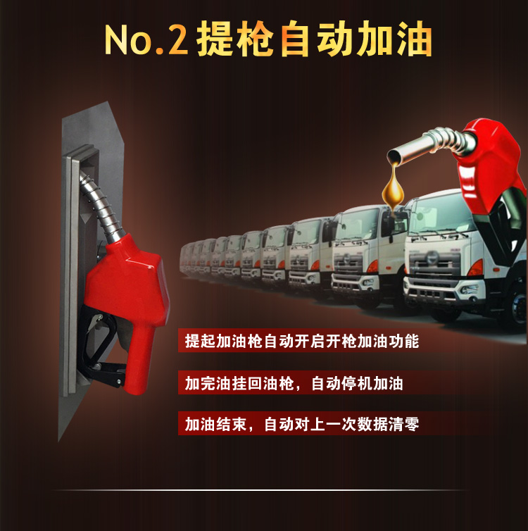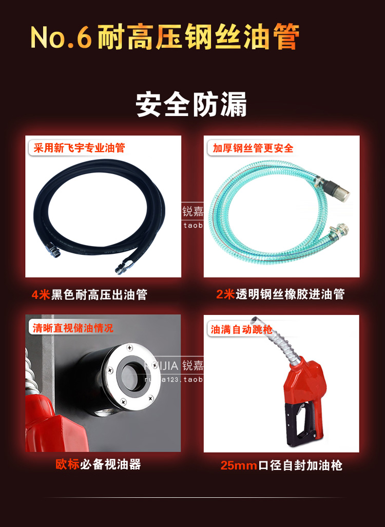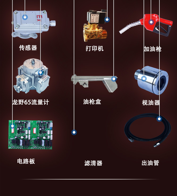 六分出油管6米(黑色橡膠鋼絲管),1寸進油管2米(透明鋼絲膠管),鑰匙一把,六分加油槍一把(油滿自動跳槍),標配主機(采用龍野65活塞式流量計)。